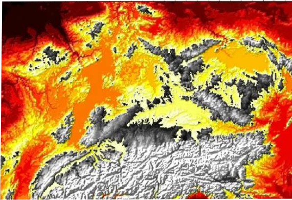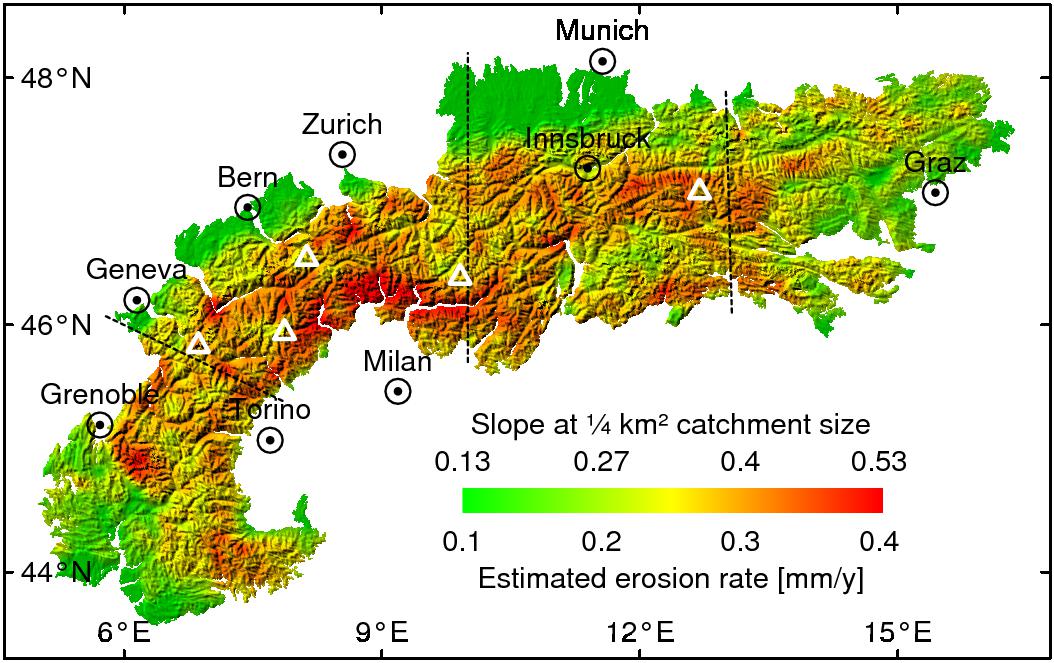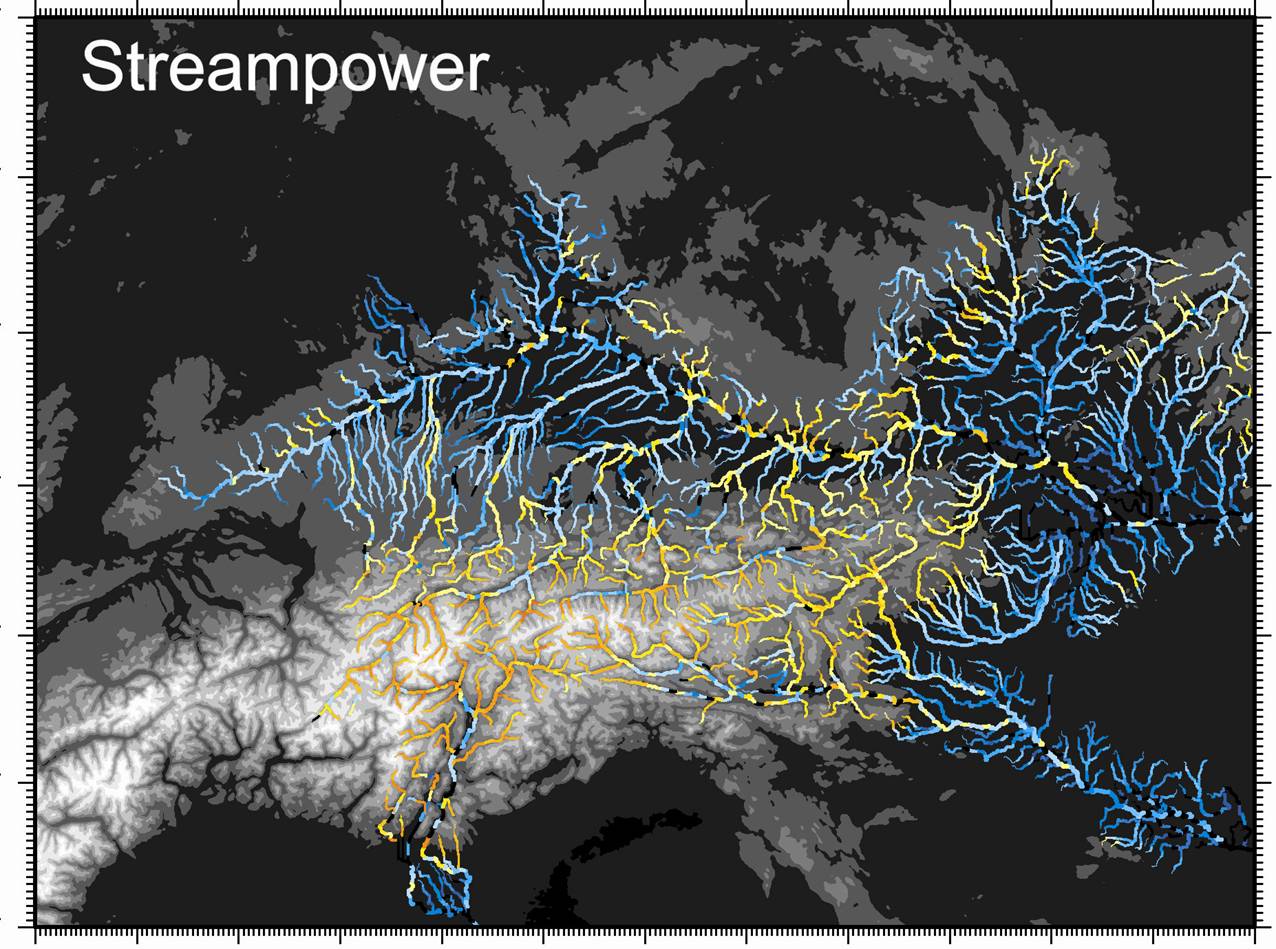 | Here is a map of stream power in the eastern Alps. You can click it to get a larger version.; |